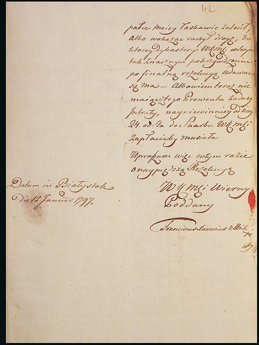 Kamera Wojny i Domen w Białymstoku 1795-1807. List Izabeli Branickiej do króla pruskiego w spraiwe podatku, sygn. 2450, k. 42