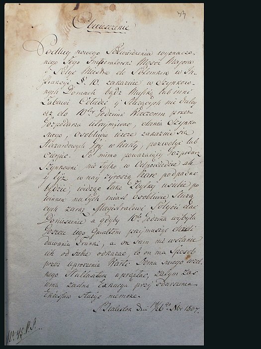 Kamera Wojny i Domen 1795-1807. Obwieszczenie o zakazie funkcjonowania gospód po godzinie 10 wieczorem, sygn. 2200, k. 33